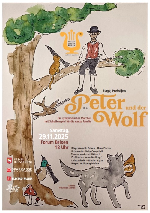 Die Bürgerkapelle Brixen lädt alle ein zum Märchen "Peter und der Wolf" von Sergej Prokofjew
